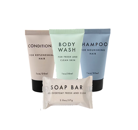 Travel size soap, shampoo, conditioner and body wash in every full bath.